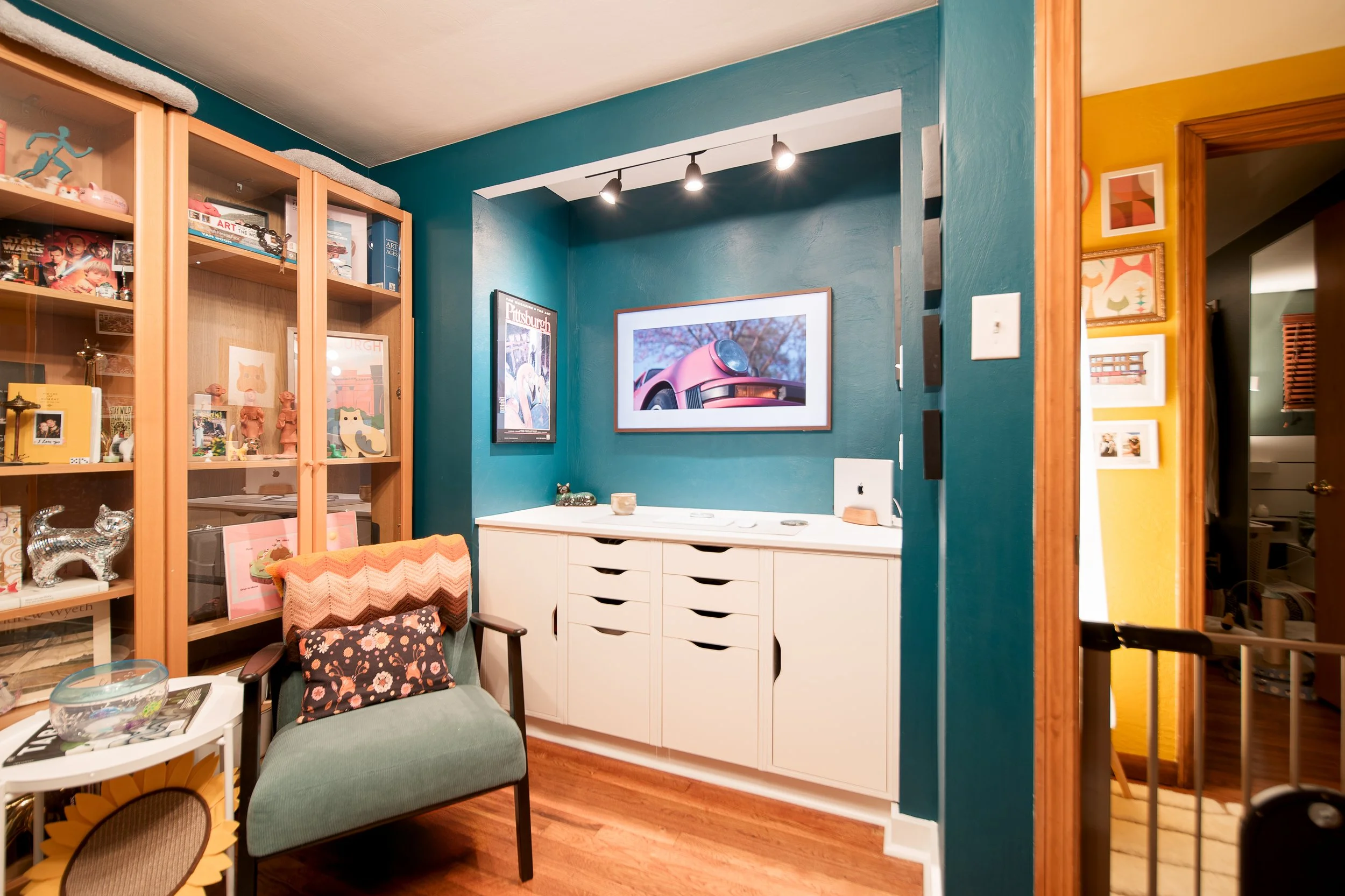 For this project, I transformed an old closet into a fully functional office niche. The walls were squared off, new lighting and USB outlets were added, and all TV wiring was hidden for a clean setup with a Frame TV. The customer wanted to repurpose existing IKEA drawer units, which I integrated into custom built-ins with an interior outlet for their accessories, creating a streamlined and practical workspace.